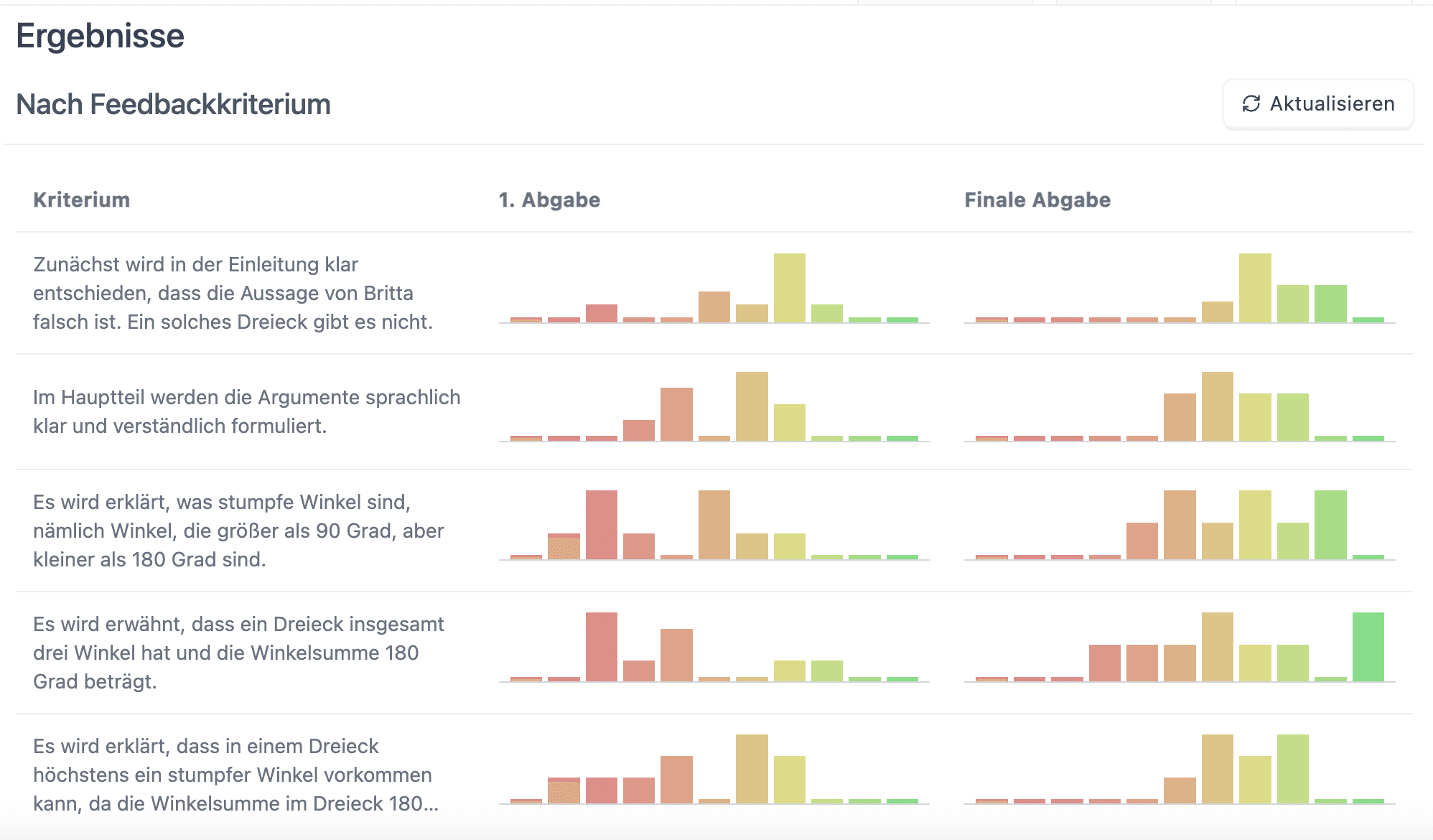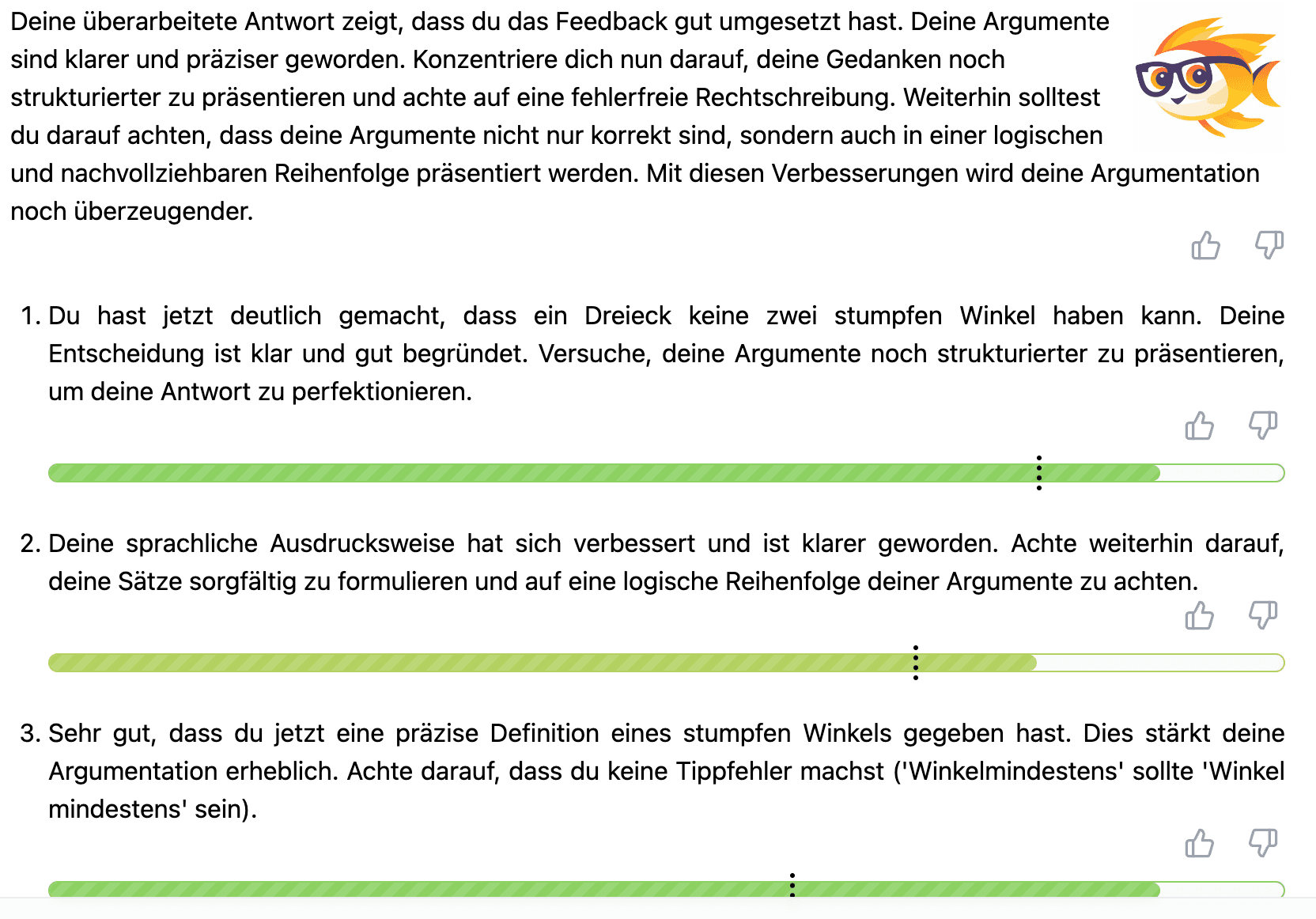 Das Echo der Klasse war durchweg positiv: Die Schüler*innen konnten das Feedback gut nachvollziehen und fühlten sich dadurch in ihrem Lernprozess unterstützt. Die konkreten Kriterien, die ich festgelegt hatte und auf die sich das Feedback bezog, waren dabei ihrer Ansicht nach sehr hilfreich. Das Feedback beinhaltet sowohl Lob als auch konstruktive Kritik, was die Lernenden sichtlich motivierte. Vor allem die farbigen Fortschrittsbalken, die zu jedem Kriterium ausgegeben werden und die (durch die gestrichelte Linie) die Weiterentwicklung anzeigen, sind aus Schüler*innensicht besonders hilfreich.
