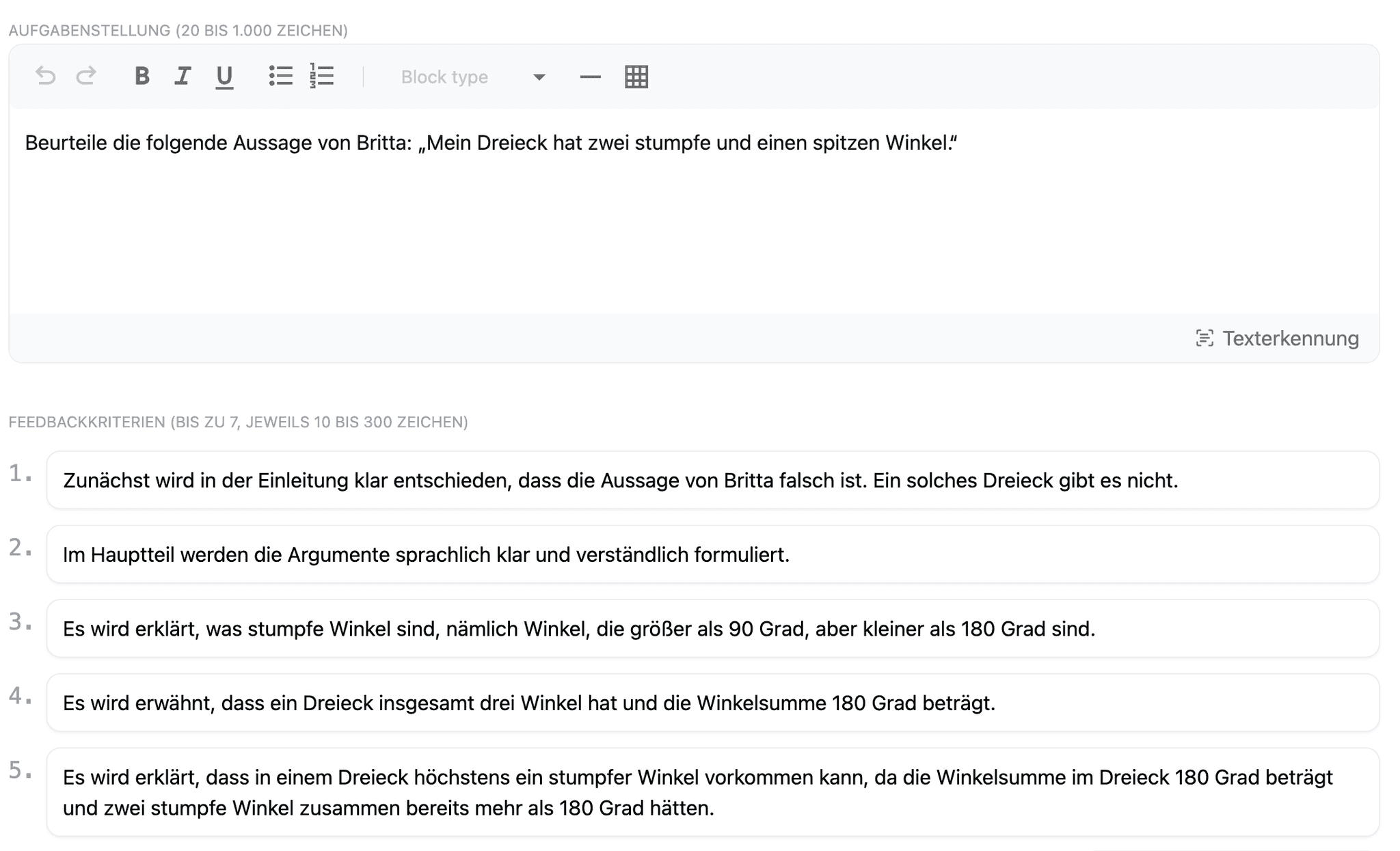 Die Erstellung der Aufgabe in Fiete war einfach und selbsterklärend. Innerhalb von ca. zehn Minuten hatte ich die Kriterien für das Feedback hinterlegt und konnte die Aufgabe live stellen. Für mathematische Argumentationen empfiehlt es sich nach meiner bisherigen Erfahrung - anders als in den in der App angelegten Vorlagen z.B. für Inhaltsangaben - nicht nur formale, sondern auch inhaltliche Kriterien zur korrekten Lösung der Aufgabe festzulegen, anhand derer Fiete das Schülerfeedback generieren soll (siehe Kriterien unten).