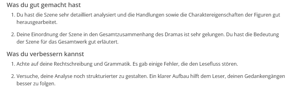 „Ihr Text ist sehr ausführlich, detailreich und genau recherchiert. Sie haben sehr interessante Verknüpfungen von den verschiedenen Szenen des Stückes hergestellt. Bei der Ausdrucksweise empfehle ich folgendes: Versuchen Sie, logische Verknüpfungen zwischen den einzelnen Gebieten herzustellen. Verwenden Sie auch Absätze, um logisch aufgebauten und übersichtlichen Text zu schreiben. Vermeiden Sie unnötige Wiederholungen und Zeitformen, um die Lesbarkeit und Verständlichkeit zu verbessern. Vermeiden Sie auch Satzzeichenfehler, damit die Leser den Text leicht verstehen können.“