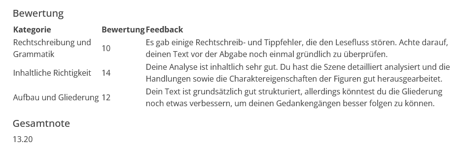 Ergänzt werden diese Hinweise durch eine „Bewertung“, in der die Kriterien (hier: „Kategorien“) aufgeführt, mit einer Notenpunktzahl (meine Vorauswahl), einem „Feedback“ und einer Gesamtnote versehen werden.