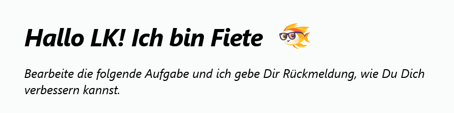 Die Schülerlösung gebe ich im Feld ‚Version 1‘ ein. Auf einen Blick erkenne ich Hinweise auf Fehler (Grammatik, Rechtschreibung) und bearbeite diese. Dann klicke auf das Feld ‚Fiete, gib mir Feedback!‘. Das dauert ein wenig, etwa 60 Sekunden. Währenddessen erscheint der Fiete-Fisch und ein Text: „Blub, ich lese deinen Text und denke nach.“ Nach dieser kleinen Pause erhalte ich (bzw. mein Schüler) das folgende Feedback: